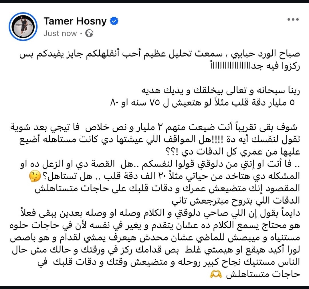 تامر حسني اختار هذه المرة أن يخرج عن إطار الأخبار الفنية المعتادة، ويوجه رسالة مباشرة لجمهوره، دعاهم فيها لإعادة التفكير في الضغوط والمشكلات اليومية التي تستنزف طاقتهم دون مقابل حقيقي، مؤكدًا أن الإنسان كثيرًا ما يهدر أغلى ما يملك دون أن يشعر، وهو عمره، وقال نجم الجيل: «صباح الورد حبايبي ، سمعت تحليل عظيم أحب أنقلهلكم جايز يفيدكم بس ركزوا فيه جدا ربنا سبحانه و تعالى بيخلقك و يديك هديه ه مليار دقة قلب مثلاً لو هتعيش ل ٧٥ سنه او ۸۰، شوف بقى تقريباً أنت ضيعت منهم ۲ ملیار و نص خلاص فا تيجي بعد شوية تقول لنفسك أيه دة !! هل المواقف اللي عيشتها دي كانت مستاهله أضيع عليها من عمري كل الدقات دي !؟ فا أنت أو إنتي من دلوقتي قولوا لنفسكم .. هل القصة دي او الزعل ده او المشكله دي هتاخد من حياتي مثلاً ۲۰ الف دقة قلب .. هل تستاهل ؟المقصود إنك متضيعش عمرك و دقات قلبك على حاجات متستاهلش الدقات اللي بتروح مبترجعش تاني".