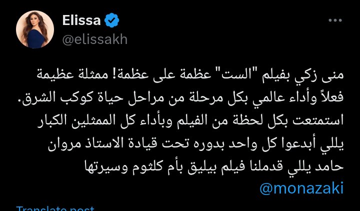 وكتبت إليسا في منشور رصده موقع تحيا مصر على حسابها الرسمي بموقع التدوينات القصيرة إكس، أو تويتر سابقا، ورصده موقع تحيا مصر: "منى زكي بفيلم "الست" عظمة على عظمة! ممثلة عظيمة فعلاً وأداء عالمي بكل مرحلة من مراحل حياة كوكب الشرق".