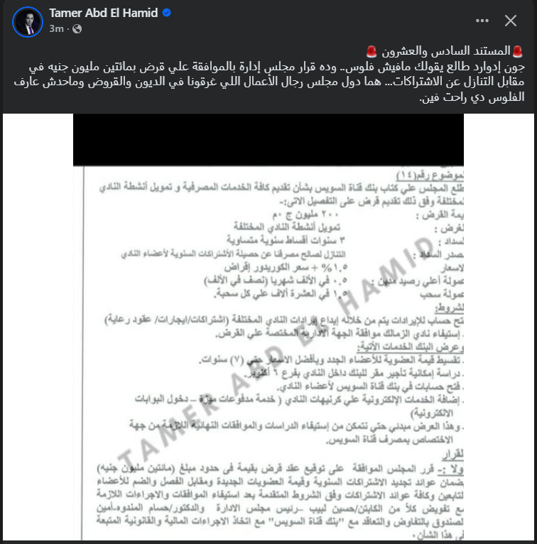 وكتب تامر عبد الحميد عبر حسابه الرسمي"فيس بوك": المستند السادس والعشرون، جون إدوارد طالع يقولك مفيش فلوس، وده قرار مجلس إدارة بالموافقة علي قرض200 مليون جنيه في مقابل التنازل عن الاشتراكات".
