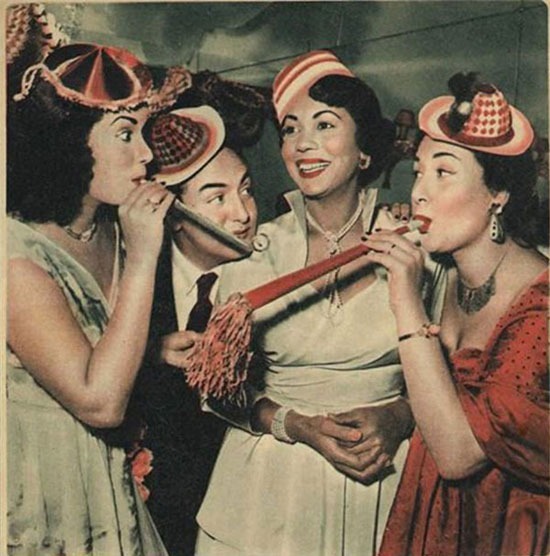 ومن الصور الجماعية اللافتة، تلك التي جمعت الفنان أنور وجدي، وعمر الحريري، وليلى فوزي، ومريم فخر الدين وزوجها آنذاك المخرج محمود ذو الفقار، إلى جانب الفنان سعيد أبو بكر. الجميع ارتدوا قبعات رأس السنة، وبدت السعادة واضحة على وجوههم، في مشهد عفوي يعكس بساطة وصدق علاقات نجوم ذلك الزمن، ولم تخلُ احتفالات رأس السنة من المقالب، وكانت الفنانة الاستعراضية نعيمة عاكف بطلتها بلا منازع. ففي إحدى السهرات، شاركت محمد فوزي في تنفيذ مقلب طريف ضد عبد السلام النابلسي، حين وضعت له “شطة” بدلًا من السكر في فنجان القهوة، وما إن بدأ يشرب، حتى انفجرت نعيمة ضاحكة، بينما وقف محمد فوزي يراقب المشهد في صمت، وفي صورة أخرى من نفس الأجواء، ظهرت نعيمة عاكف مرتدية قبعة غريبة، والنابلسي يشرب قهوته مرتديًا قبعة مضحكة، لتتحول الليلة إلى ذكرى لا تُنسى.