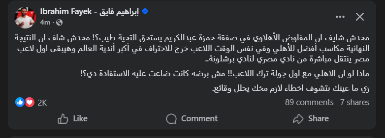 تحيا مصر، وأكد إبراهيم فايق، في منشوره أن المفاوض الأهلاوي يستحق التحية والإشادة، مشيراً إلى أن النتيجة النهائية للصفقة حققت "مكاسب أفضل للأهلي" على الصعيدين المادي والرياضي.