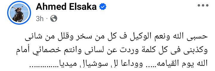 وقال أحمد السقا في منشور رصده موقع تحيا مصر على حسابه الرسمي بموقع التواصل الاجتماعي فيسبوك: حسبي الله ونعم الوكيل في كل من سخر وقلل من شأني وكذبني فى كل كلمة وردت عن لسانى وانتم خصمائي أمام الله يوم القيامة.. ووداعا للسوشيال ميديا.