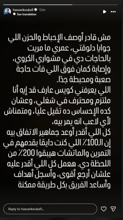 تحيا مصر، وكتب أحمد حسن كوكا عبر حسابه الرسمي"انستجرام": مش قادر أوصف الإحباط والحزن اللي جوايا دلوقتي، عمري ما مريت بالحاجات دي في مشواري الكروي، وإصابة كمان فوق اللي فات حاجة صعبة ومحبطة جدًا".