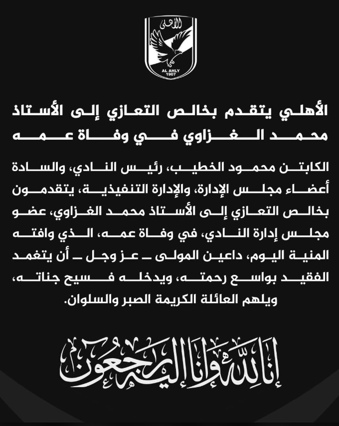 أعلن النادي الأهلي اليوم الأحد، 4 يناير 2026، وفاة عم محمد الغزاوي، عضو مجلس إدارة النادي.