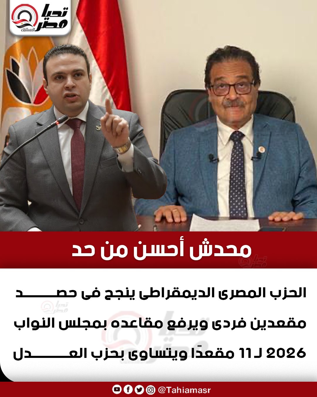محدش أحسن من حد.. الحزب المصرى الديمقراطى ينجح فى حصد مقعدين فردى ويرفع مقاعده بمجلس النواب 2026 لـ 11 مقعدًا ويتساوى بحزب العدل