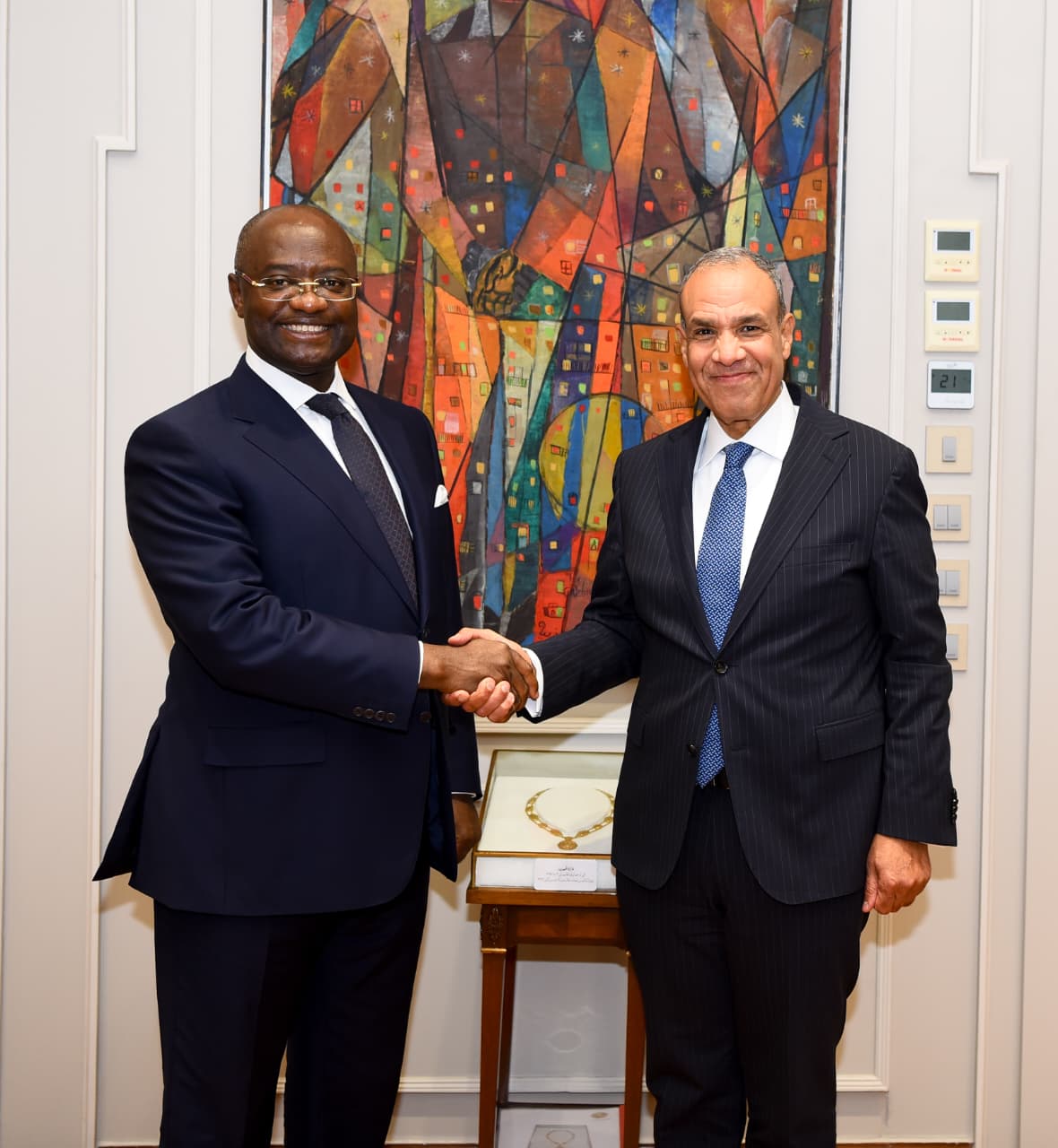 وقدم الوزير عبد العاطي التهنئة لرئيس البنك على توليه مهام منصبه الجديد، مشيداً خلال اللقاء بدور البنك في تعزيز التجارة البينية بين الدول الأفريقية، وتفعيل اتفاقية التجارة الحرة القارية، مؤكداً الحرص على تعزيز التعاون مع البنك الأفريقي للتصدير والاستيراد في هذا السياق، فضلاً عن إمكانية تنويع أطر التعاون القائمة بين مصر والبنك في الفترة المقبلة، نحو تقديم الدعم للقطاع الخاص والمستثمرين المصريين والأفارقة.