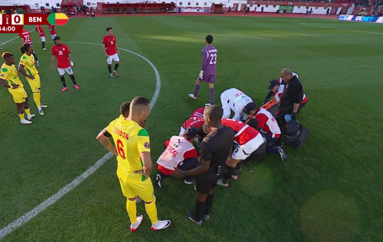 وسقط محمد حمدي على أرضية الملعب في الدقيقة 40 من عمر المباراة بعد كرة مشتركة مع لاعب منتخب بنين.