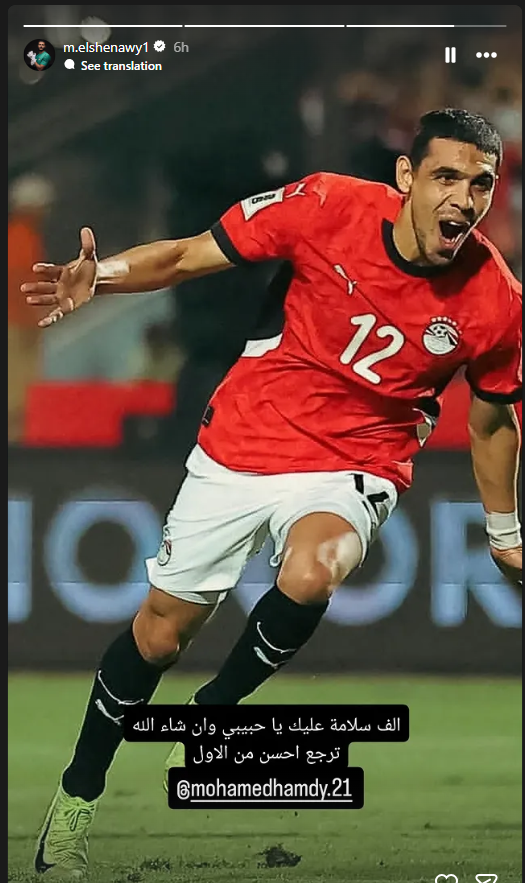 تحيا مصر، وكتب الشناوي على حساباته الرسمية على مواقع التواصل الاجتماعي: "ألف سلامة عليك يا حبيبي، وإن شاء الله ترجع أحسن من الأول"، مؤكدًا الروح العالية والتضامن بين لاعبي المنتخب في مواجهة الظروف الصعبة.