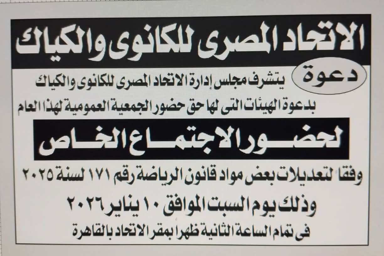يتشرف مجلس إدارة الاتحاد المصري للكانوي والكياك برئاسة اللواء أحمد كامل بدعوة الهيئات الأعضاء التي لها حق حضور الجمعية العمومية العادية لهذا العام إلى الاجتماع الخاص المقرر انعقاده يوم السبت الموافق 10 يناير الجاري في تمام الساعة الثانية ظهرًا بمقر الاتحاد بالقاهرة، ويستعرض تحيا مصر التفاصيل.