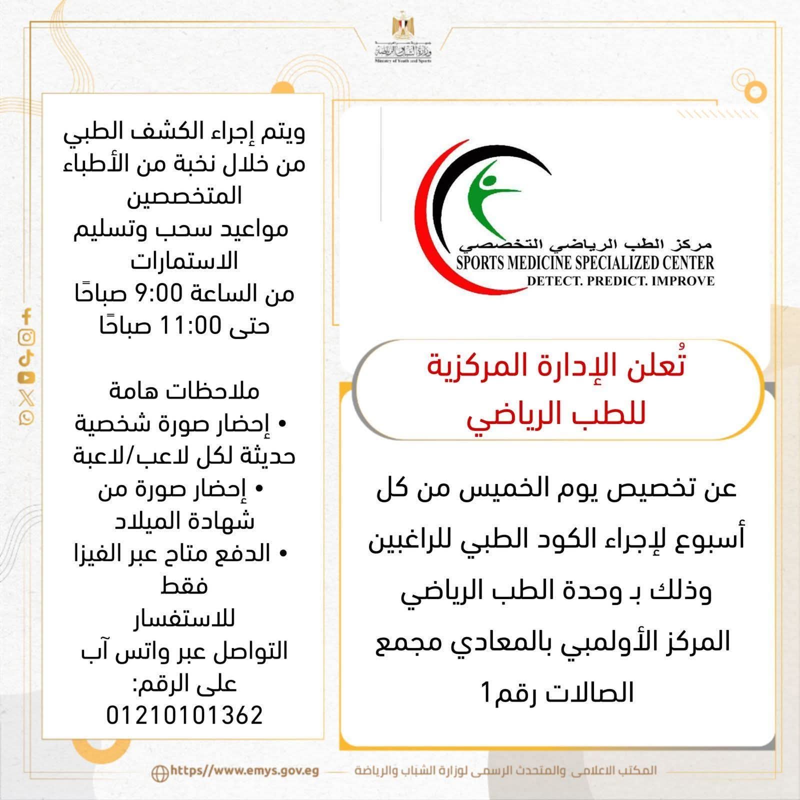 وأعلنت الإدارة المركزية للطب الرياضي بقيادة الدكتور عمرو الحداد، عن تخصيص يوم الخميس من كل أسبوع للراغبين في إجراء الكود الطبي.