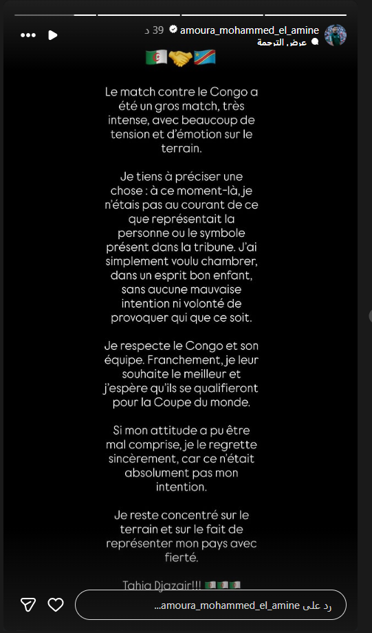 حرص محمد أمين عمورة، لاعب منتخب الجزائر، على توضيح موقفه بعد الجدل الذي أثير عقب مباراة منتخب بلاده أمام الكونغو، وذلك من خلال رسالة نشرها عبر حسابه الرسمي على موقع إنستجرام.