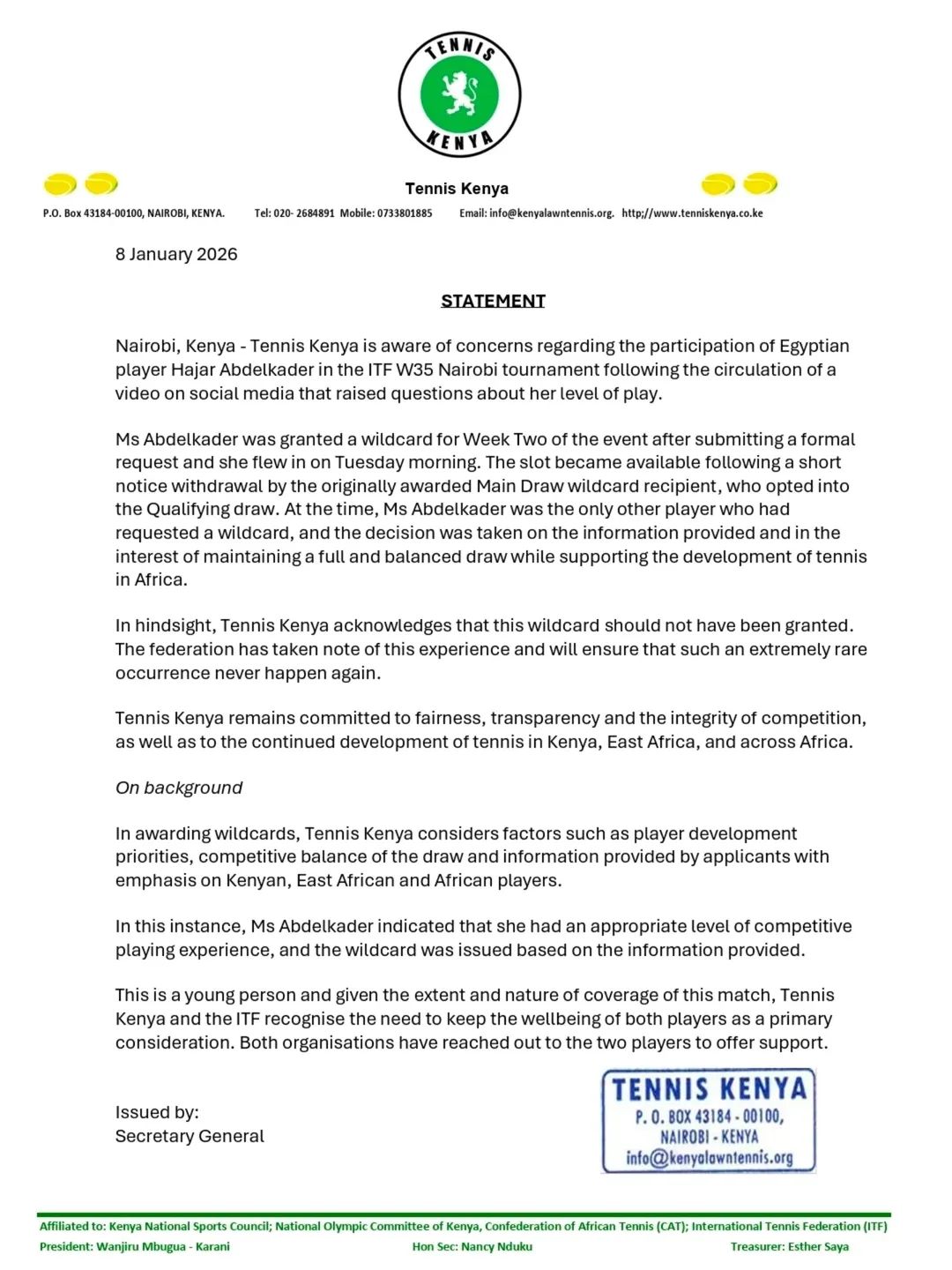 ولفت الاتحاد إلى أنه نظرًا لصغر سن اللاعبة وحجم التغطية الإعلامية لهذه المباراة، يولي الاتحاد الكيني والاتحاد الدولي للتنس أهمية قصوى لسلامة اللاعبين، وقد تواصلت المنظمتان مع اللاعبين لتقديم الدعم اللازم.