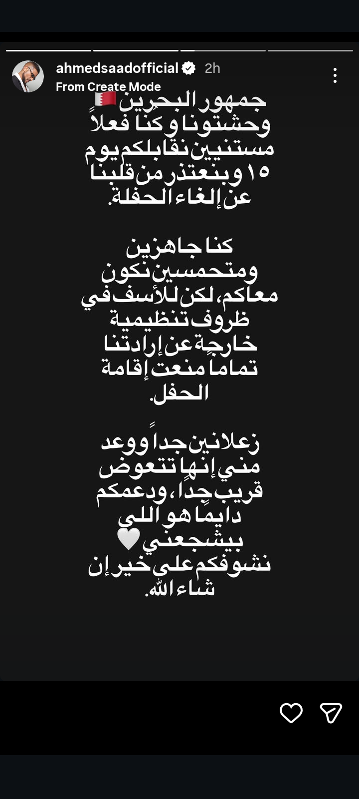 وكتب أحمد سعد في منشور رصده موقع تحيا مصر على حسابه الرسمي بموقع تبادل الصور والفيديوهات انستجرام، من خلال خاصية ستوري: "جمهور البحرين وحشتونا وكنا فعلًا مستنيين نقابلكم يوم 15، وبنعتذر من قلبنا عن إلغاء الحفلة، كنا جاهزين ومتحمسين نكون معاكم، لكن للأسف في ظروف تنظيمية خارجة عن إرادتنا تمامًا منعت إقامة الحفل، زعلانين جدًا ووعد مني إنها تتعوض قريب جدًا، ودعكم دايما هو اللي بيشجعني".