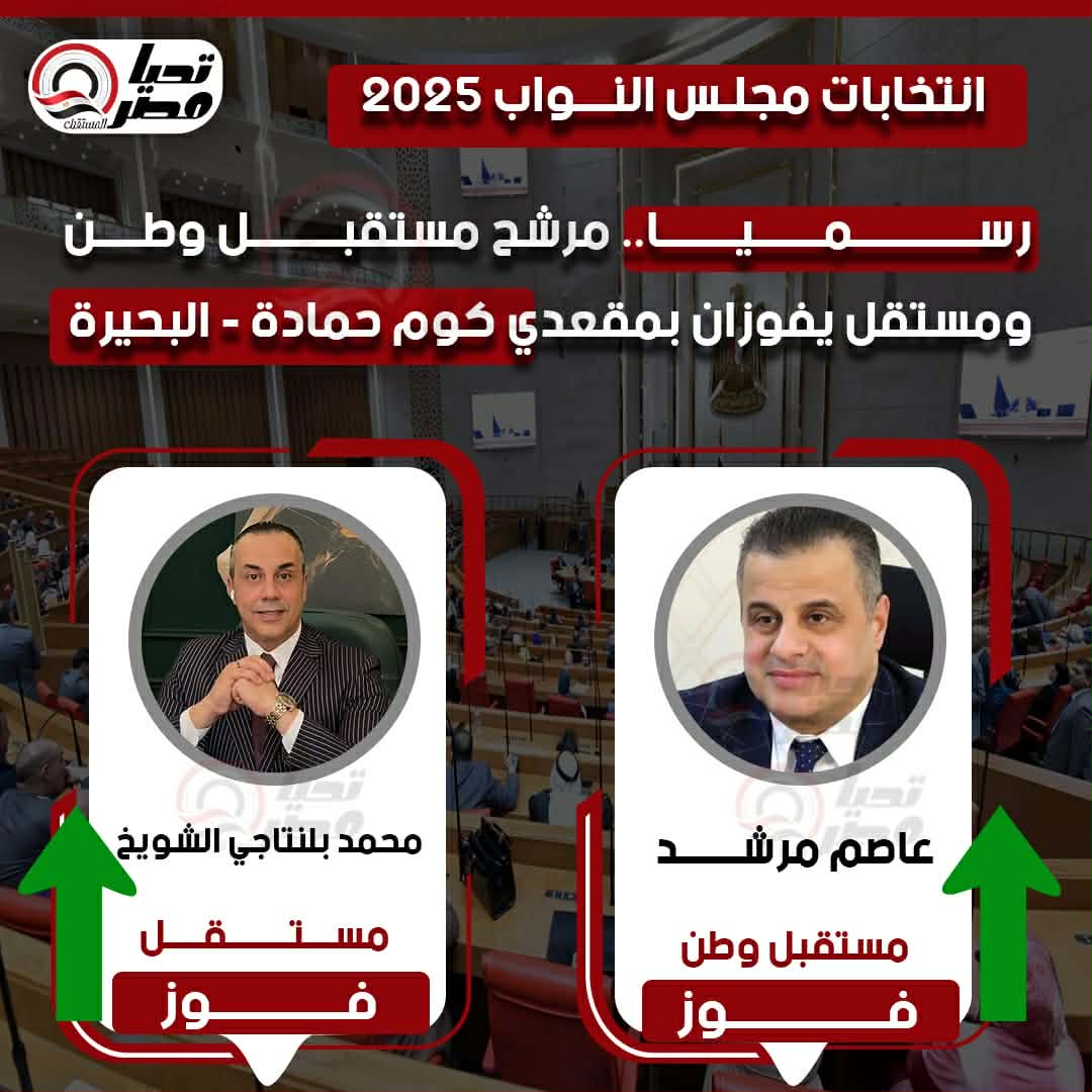 وأسفرت نتيجة انتخابات مجلس النواب عن فوز مرشح مستقبل وطن عاصم مرشد، والمرشح المستقل محمد بلنتاجي الشويخ، بمقاعد دائرة كوم حمادة بمحافظة البحيرة لتكتمل مقاد الدائرة داخل البرلمان في الفصل التشريع الثالث.