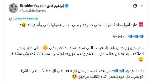 وكتب إبراهيم فايق عبر حسابه الرسمي" أكس".: «عايز أقول حاجة بس استحي حد يزعل مني بس هقولها وأمري لله»، قبل أن يطالب بعدم سفر الجماهير إلى المغرب خلال الفترة المقبلة.