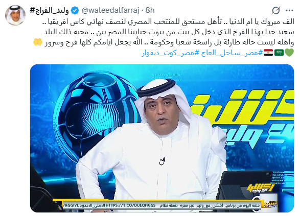 «ألف مبروك يا أم الدنيا».. الإعلامي السعودي وليد الفراج يهنئ منتخب مصر بعد التأهل لنصف نهائي أمم أفريقيا