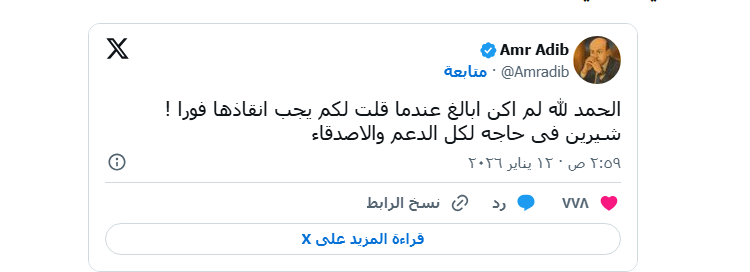 وأكد أديب لاحقًا، في منشور عبر منصة «إكس»، أنه لم يبالغ في حديثه، مشددًا على أن صاحبة «جرح تاني» تحتاج إلى دعم حقيقي من أصدقائها والمحيطين بها، في ظل ما تمر به من ضغوط نفسية قاسية.