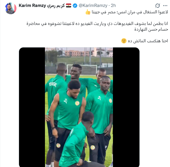 أكد الإعلامي كريم رمزي، أن ما تداوله لاعبو منتخب السنغال خلال مرانهم الأخير يعكس حالة من الثقة الزائدة قبل مواجهة مصر، مشيرًا إلى أن بعض اللاعبين رددوا عبارات من بينها: «مصر في جيبنا».