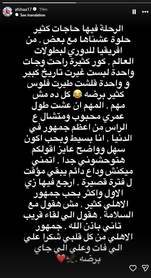 تحيا مصر، وقال أفشة في منشور عبر حسابه الشخصي: «الرحلة مع الأهلي مليئة بالذكريات الجميلة، من البطولات الإفريقية للدوري وكأس العالم للأندية. المهم أنني كنت محبوبًا بين أعظم جمهور في العالم».