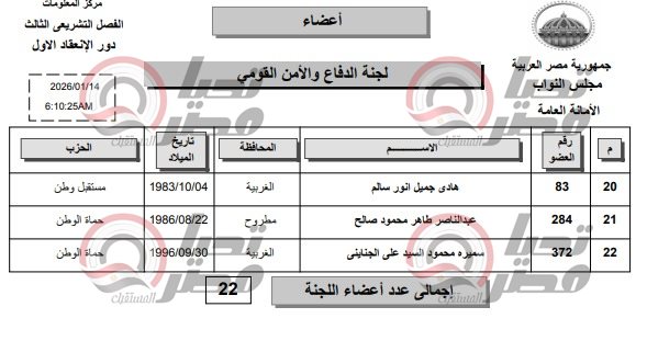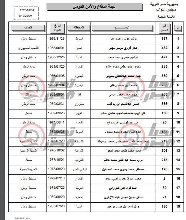 ويعكس هذا التشكيل تنوعًا سياسيًا وجغرافيًا داخل اللجنة، التي تضطلع بملفات شديدة الحساسية تشمل شؤون الدفاع، والأمن القومي، والسيادة، ومواجهة التهديدات الداخلية والخارجية، ومتابعة السياسات الاستراتيجية للدولة.