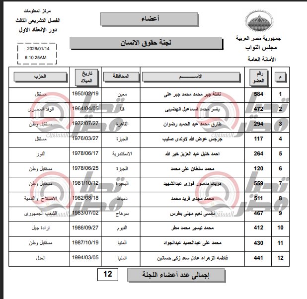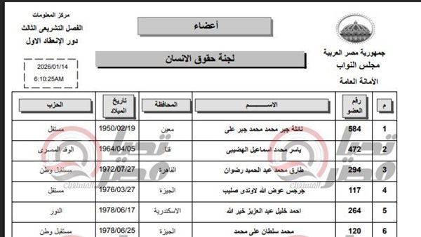 أسماء أعضاء لجنة حقوق الإنسان بمجلس النواب
