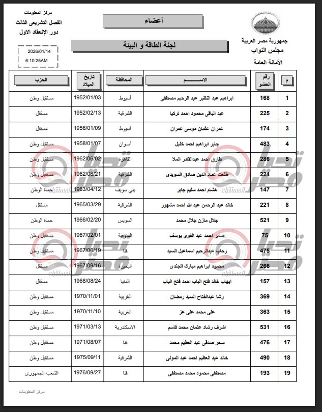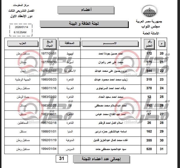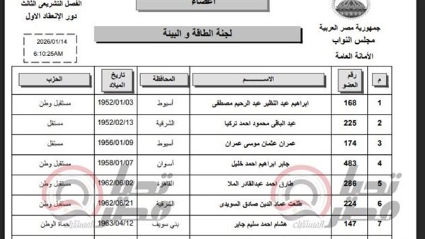 أسماء أعضاء لجنة الطاقة والبيئة بمجلس النواب