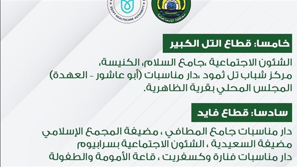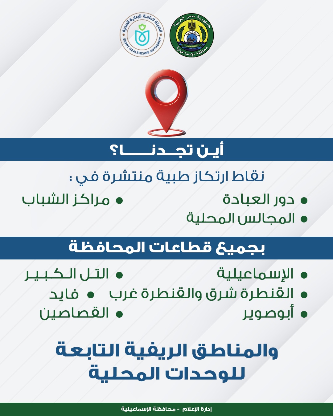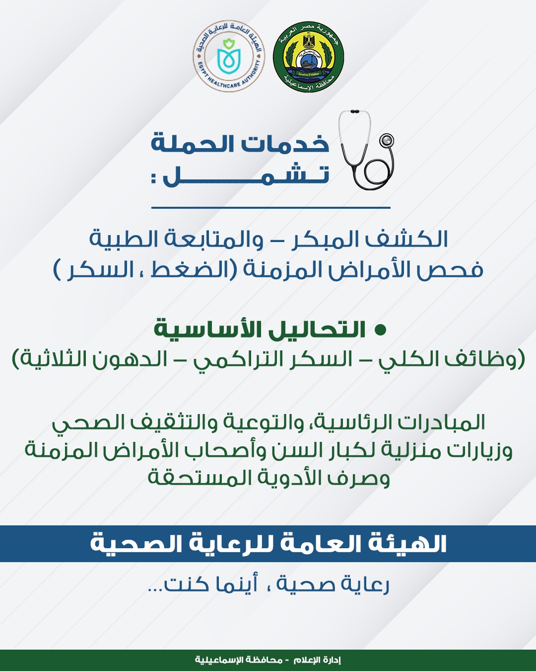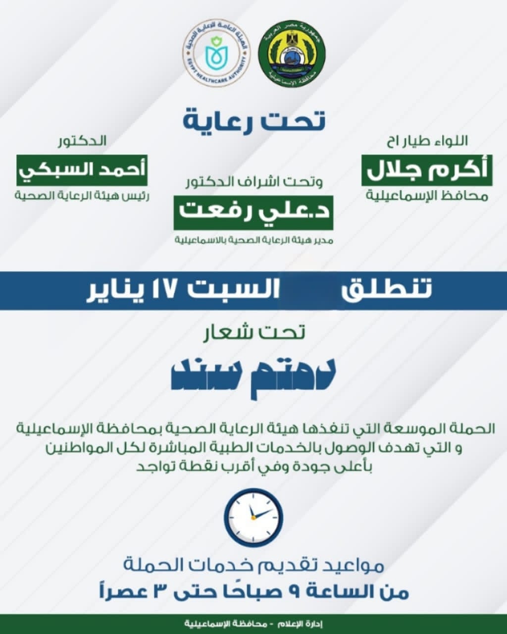 تحت رعاية اللواء طيار أ.ح أكرم محمد جلال محافظ الإسماعيلية، والدكتور أحمد السبكي رئيس الهيئة العامة للرعاية الصحية، وتحت إشراف الدكتور علي رفعت مدير هيئة الرعاية الصحية بالإسماعيلية، انطلقت اليوم مبادرة «دمتم سند» في إطار دعم المنظومة الصحية والوصول بالخدمات الطبية المباشرة إلى المواطنين في أماكن تواجدهم بجميع مراكز المحافظة.