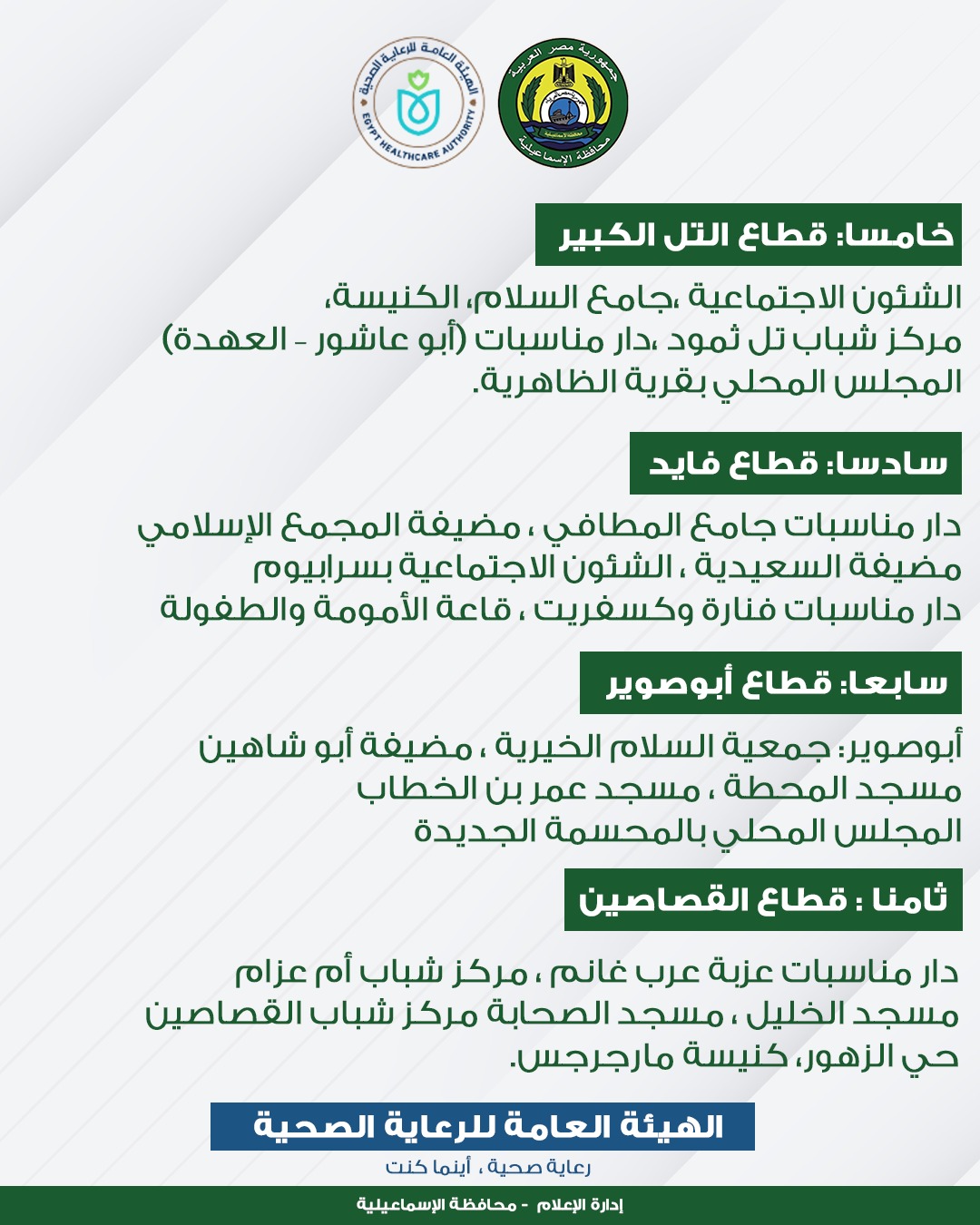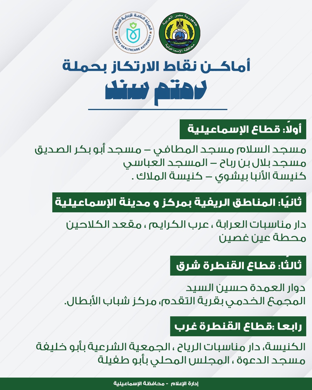 تشهد المبادرة انتشارًا واسعًا يغطي قطاعات المحافظة المختلفة، شملت قطاع الإسماعيلية والمناطق الريفية بمركز ومدينة الإسماعيلية، وقطاعي القنطرة شرق وغرب، وقطاعات التل الكبير، فايد، أبوصوير، والقصاصين، من خلال نقاط ارتكاز داخل المساجد والكنائس ودور المناسبات ومراكز الشباب والجمعيات الأهلية والمجالس المحلية، بما يضمن سهولة الوصول للمواطنين.