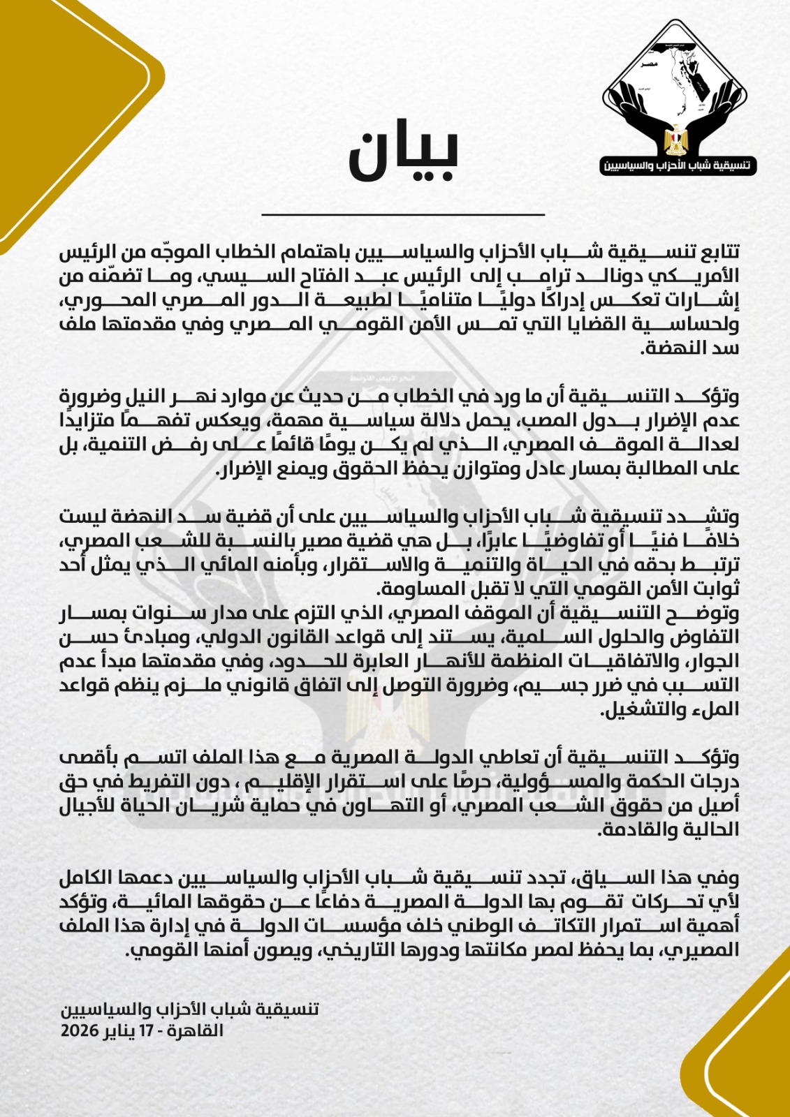 وتشدد تنسيقية شباب الأحزاب والسياسيين على أن قضية سد النهضة ليست خلافًا فنيًا أو تفاوضيًا عابرًا، بل هي قضية مصير بالنسبة للشعب المصري، ترتبط بحقه في الحياة والتنمية والاستقرار، وبأمنه المائي الذي يمثل أحد ثوابت الأمن القومي التي لا تقبل المساومة.