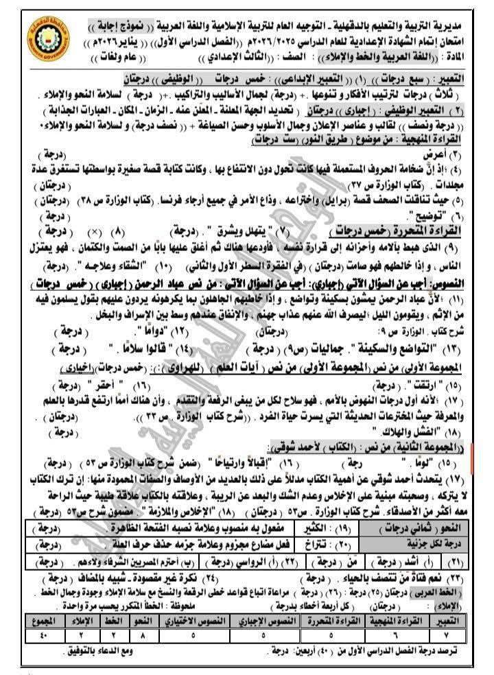 نموذج الإجابة الرسمي لامتحان اللغة العربية الفصل الدراسي الأول 2025 / 2026 بمحافظة الدقهلية