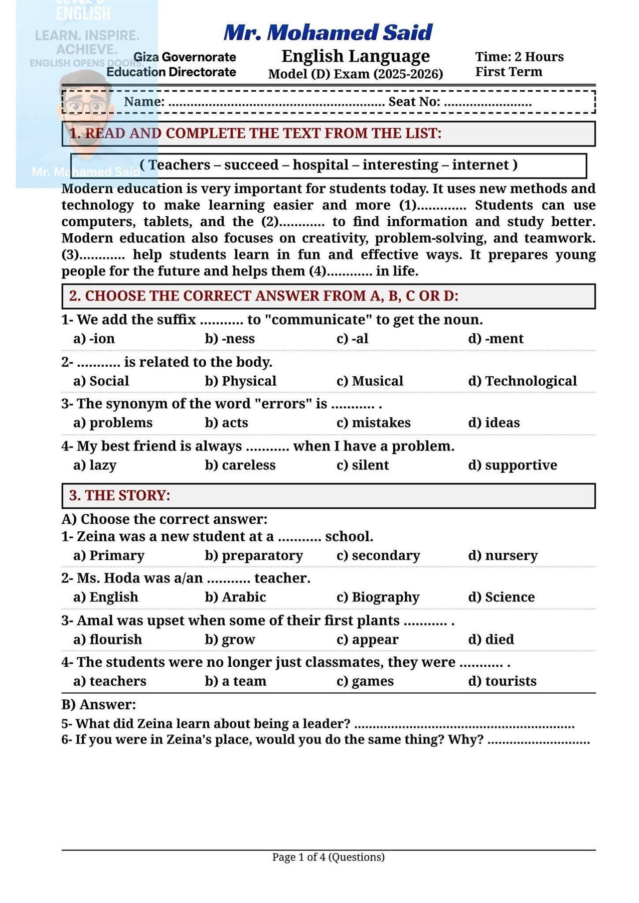 حل امتحان اللغة الإنجليزية للشهادة الإعدادية 2026 بمحافظة الجيزة