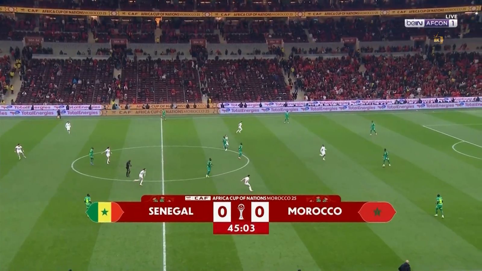شهدت الدقائق الأولى من الشوط الثاني ضغطًا متبادلًا من الفريقين، حيث حاولت السنغال اختراق دفاع منتخب المغرب عبر الهجمات السريعة، إلا أن التنظيم الدفاعي للفريق المغربي كان متينًا جدًا، مع أداء مميز من خط الدفاع وأسلوب محكم في إغلاق المساحات أمام المهاجمين السنغاليين.