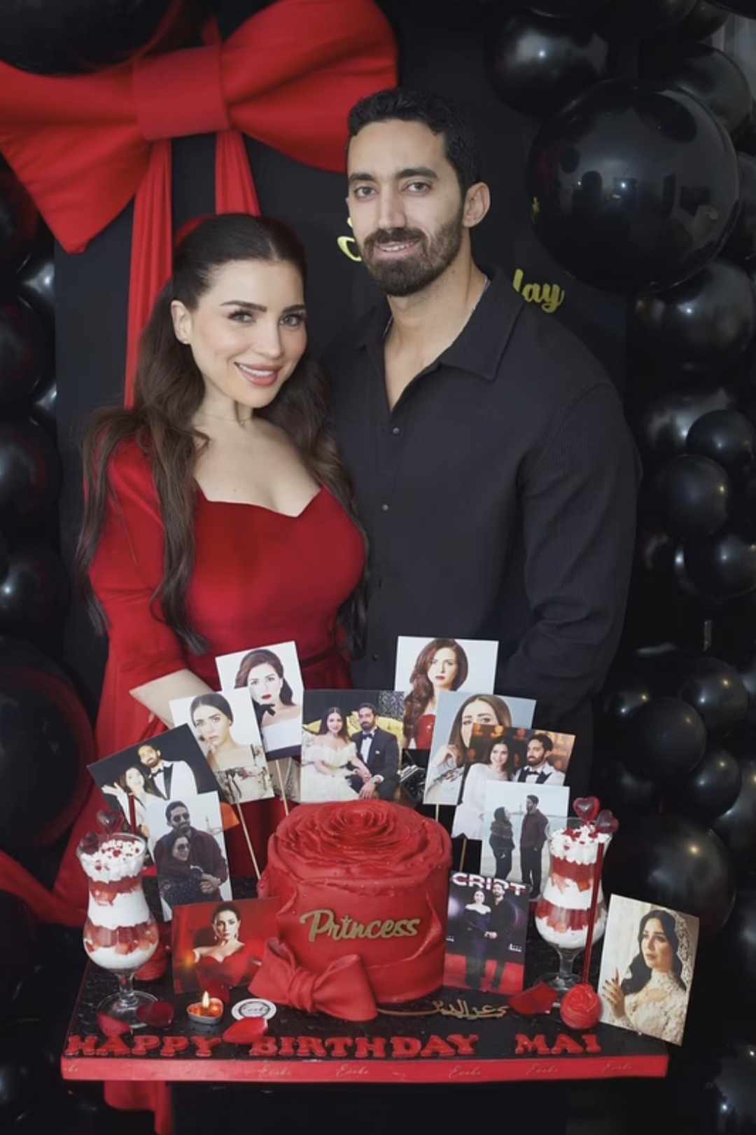 وكانت التورتة جزءاً من تفاصيل الجلسة، على شكل وردة حمراء، مزينة بصورها وصورها مع زوجها، لتضفي لمسة شخصية ودافئة على الصور.