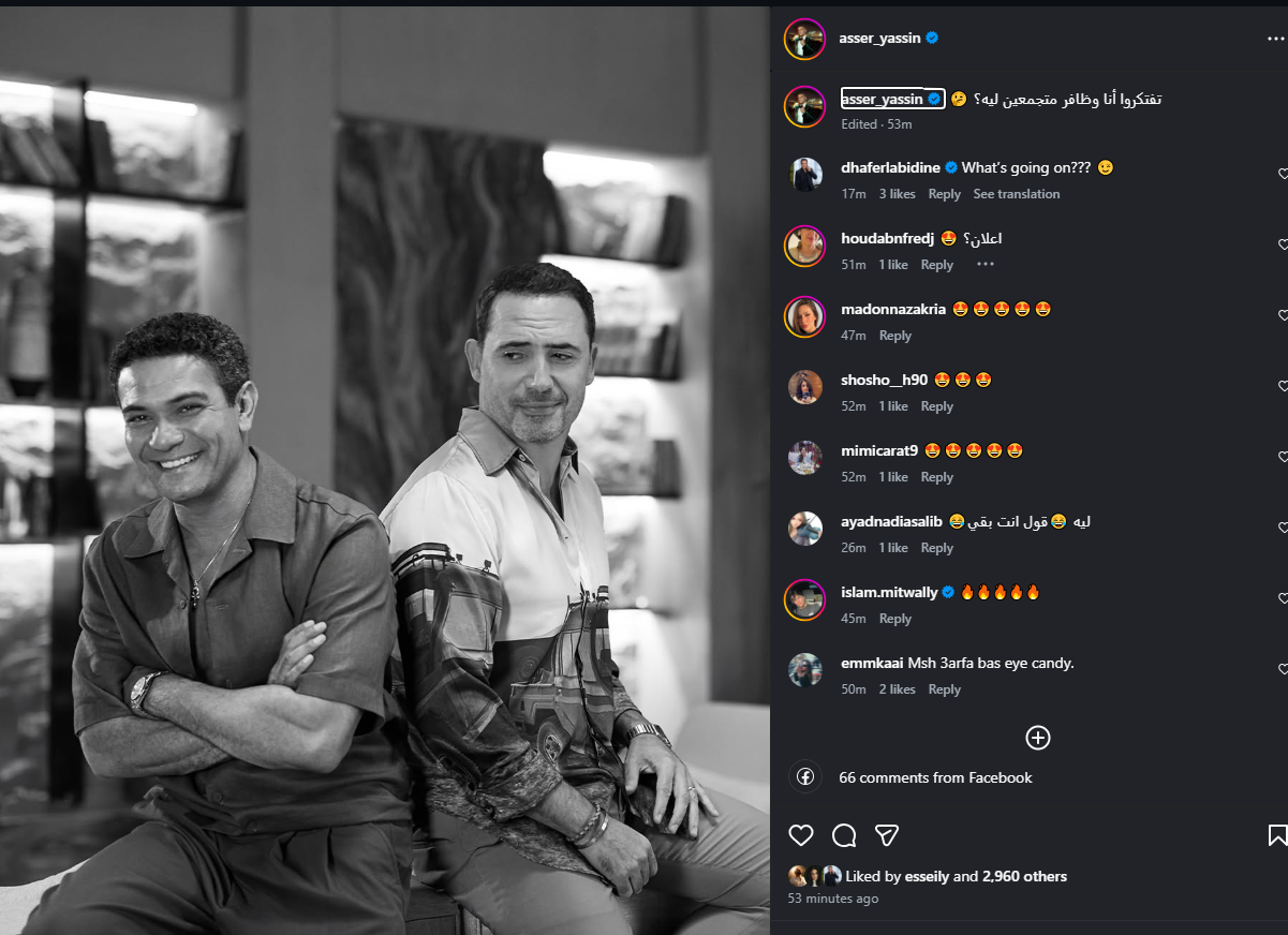 وشارك الفنان آسر ياسين، صورة تجمعه بالفنان ظافر العابدين، وفقا لما رصده موقع تحيا مصر، وذلك عبر صفحته الرسمية على موقع التواصل الاجتماعي إنستجرام، وعلق عليها: تفتكروا أنا وظافر متجمعين ليه؟.