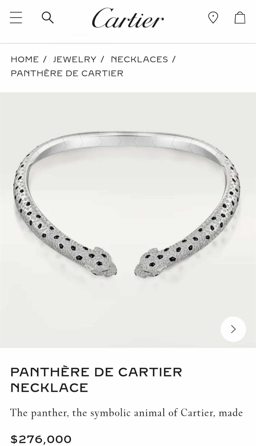 العقد جاء بتصميم مستوحى من شكل «ظهر النمر»، وهو أحد الرموز الشهيرة التي تعتمد عليها دار كارتييه في مجموعاتها الراقية، في إشارة إلى القوة والجرأة والرقي، وصُنع العقد من الذهب الأبيض عيار 18 قيراطًا، ما يمنحه بريقًا خاصًا وأناقة استثنائية تليق بالمناسبات الكبرى والسجادة الحمراء.