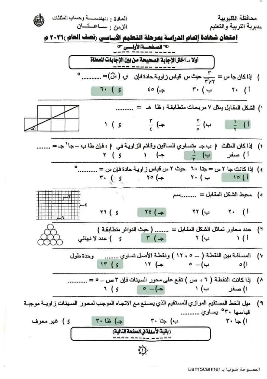 إجابات امتحان الهندسة الصف الثالث الإعدادي القليوبية 2026