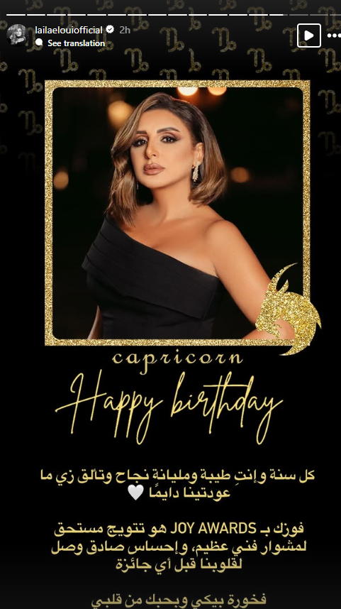 وشاركت الفنانة ليلى علوي، صورة للفنانة أنغام، وفقا لما رصده موقع تحيا مصر، وذلك عبر استوري صفحتها الرسمية على موقع التواصل الاجتماعي إنستجرام، وعلقت عليها: كل سنة وانتي طيبة ومليانة نجاح وتألق زي ما عودتينا دايمًا، فوزك بـ Joy Awards هو تتويج مستحق لمشوار فني عظيم، وإحساس صادق وصل لقلوبنا قبل أي جائزة. فخورة بيكي وبحبك من قلبي.