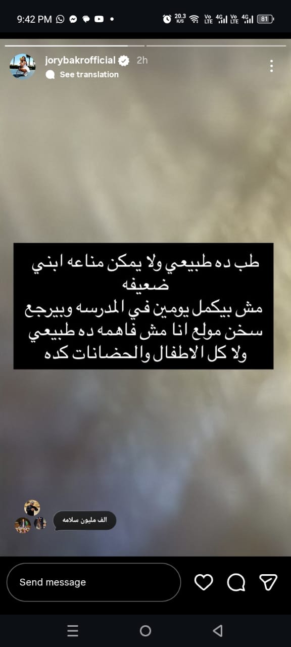 وكتبت الفنانة جوري بكر، منشورا، وفقا لما رصده موقع تحيا مصر، عبر استوري صفحتها الرسمية على موقع التواصل الاجتماعي إنستجرام، قائلة: طب ده طبيعي ولا ممكن مناعة ابني ضعيفة؟ مش بيكمل يومين في المدرسة وبيرجع سخن مولع، أنا مش فاهمة ده طبيعي ولا كل الأطفال في الحضانات كده.