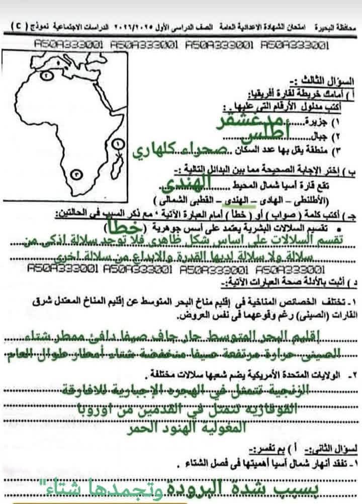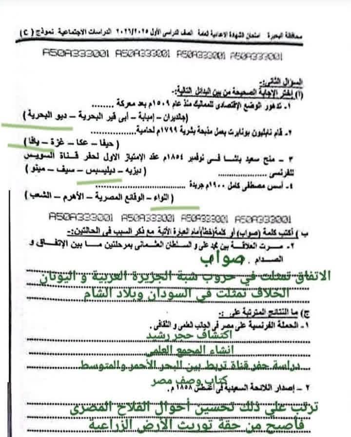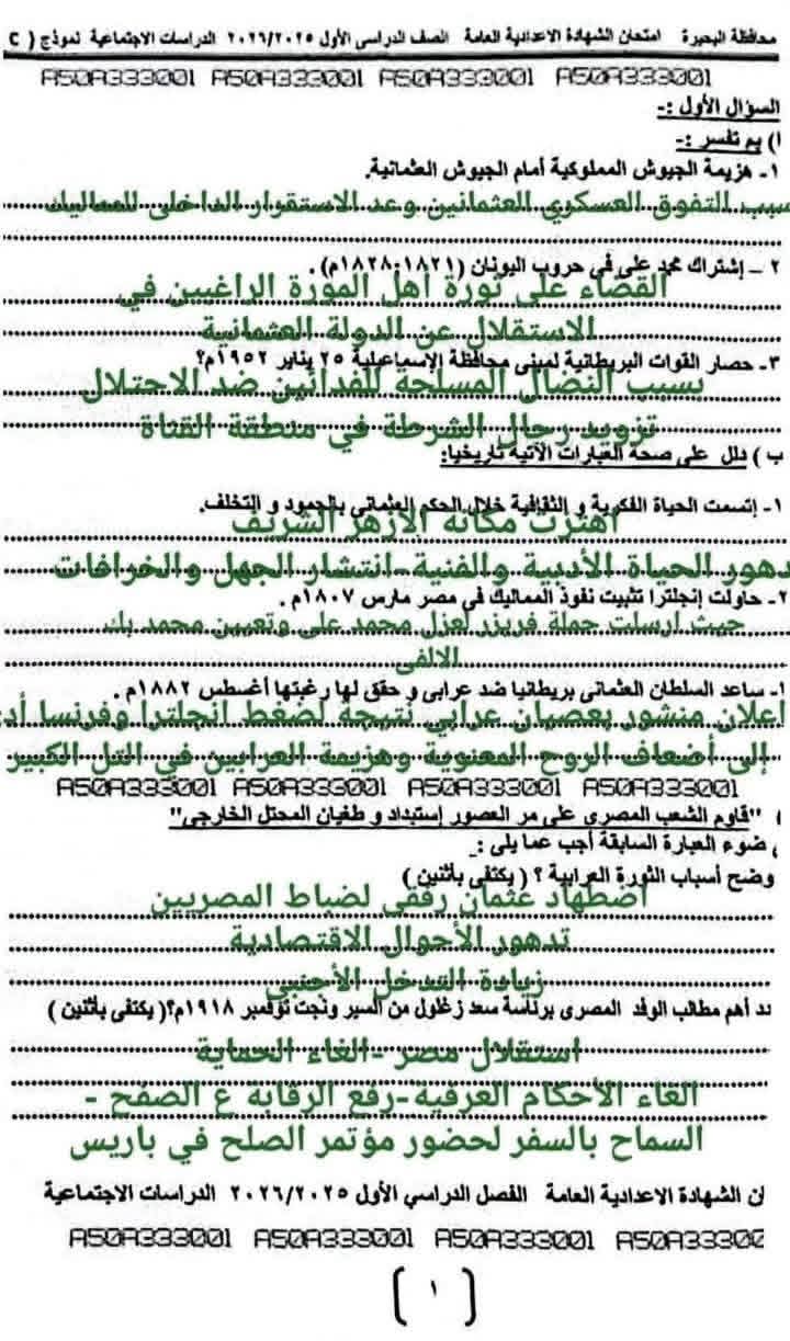 إجابات امتحان الدراسات الاجتماعية الصف الثالث الإعدادي 2026 محافظة البحيرة.. اعرف درجتك كام