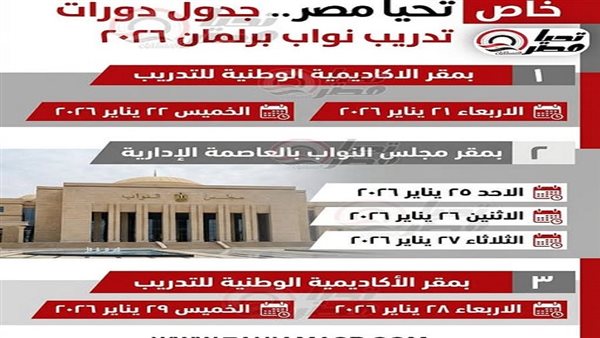 المرحلة الثانية: الأحد 25 يناير، والاثنين 26 يناير، والثلاثاء 27 يناير 2026، وتُعقد الجلسات التدريبية بمقر مجلس النواب الجديد بالعاصمة الإدارية الجديدة، والأكاديمية الوطنية للتدريب.