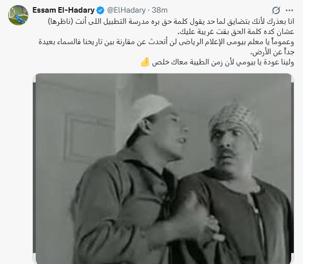 ولم يتوقف عصام الحضري عند هذا الحد، بل واصل هجومه مؤكدًا أن الحديث عن مقارنة بين تاريخه وتاريخ شوبير أمر غير مطروح، قائلًا: «وعمومًا يا معلم بيومي الإعلام الرياضي لن أتحدث عن مقارنة بين تاريخنا، فالسماء بعيدة جدًا عن الأرض»، قبل أن يختتم رسالته بجملة تحمل تهديدًا مبطنًا: «ولينا عودة يا بيومي لأن زمن الطيبة معاك خلص».