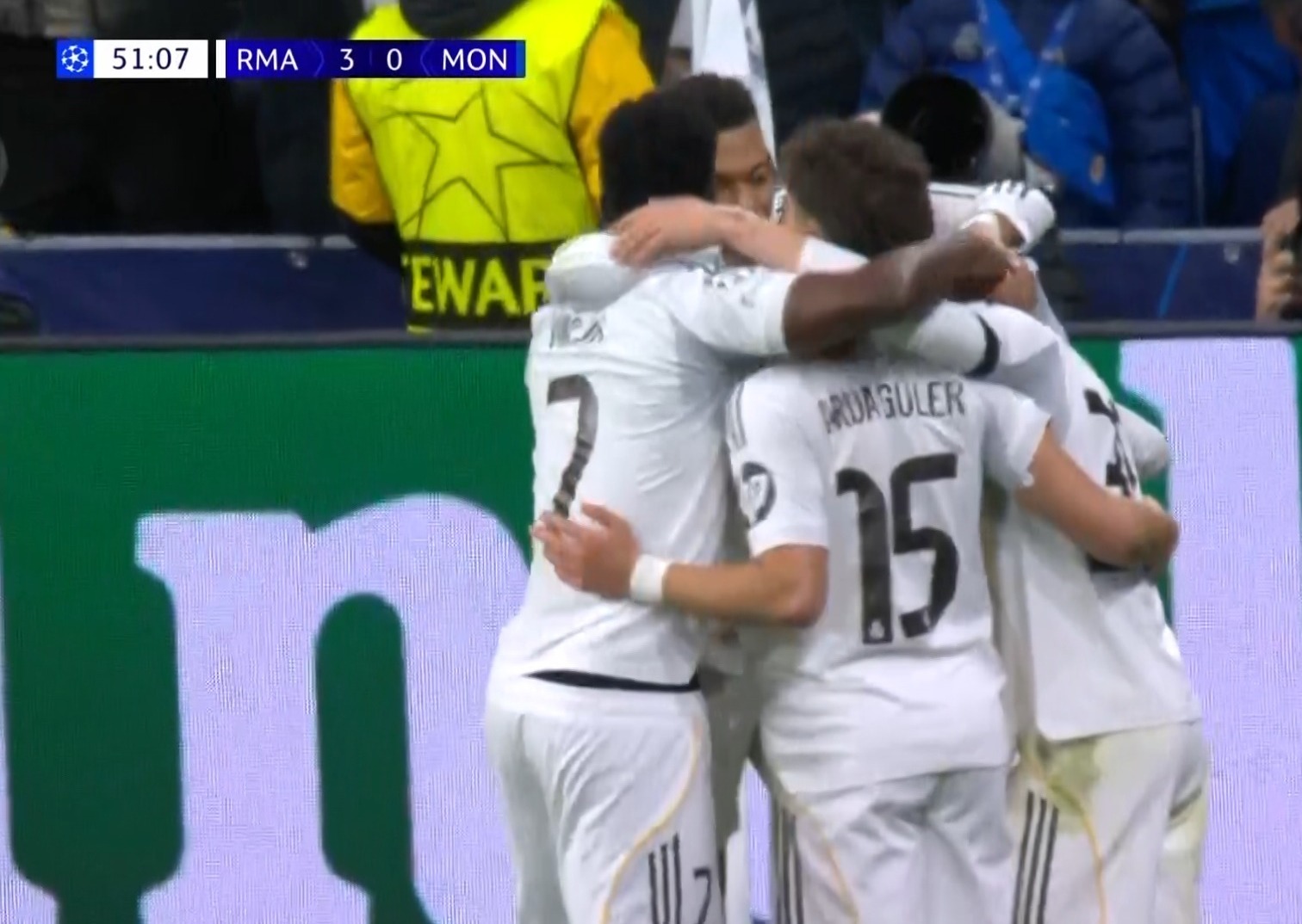 من جانبه، حاول موناكو تقليص الفارق عبر بعض المحاولات الهجومية، إلا أن التنظيم الدفاعي لريال مدريد وتألق خط الوسط حالا دون تشكيل خطورة حقيقية. ومع مرور الدقائق، بدا أن المباراة تتجه لحسم مدريدي، في ظل الفارق الفني والبدني الواضح بين الفريقين.