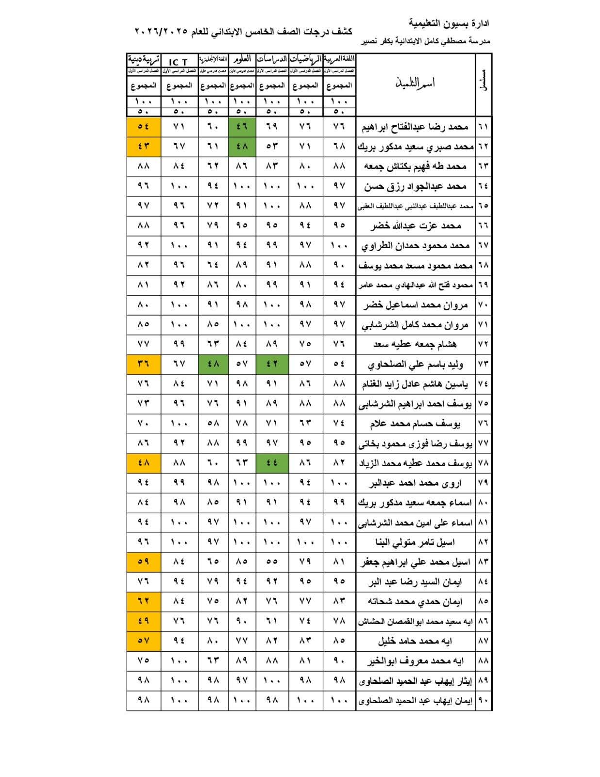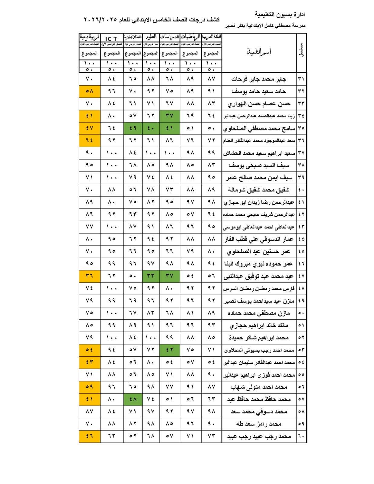 توزيع درجات الصف الخامس الابتدائي