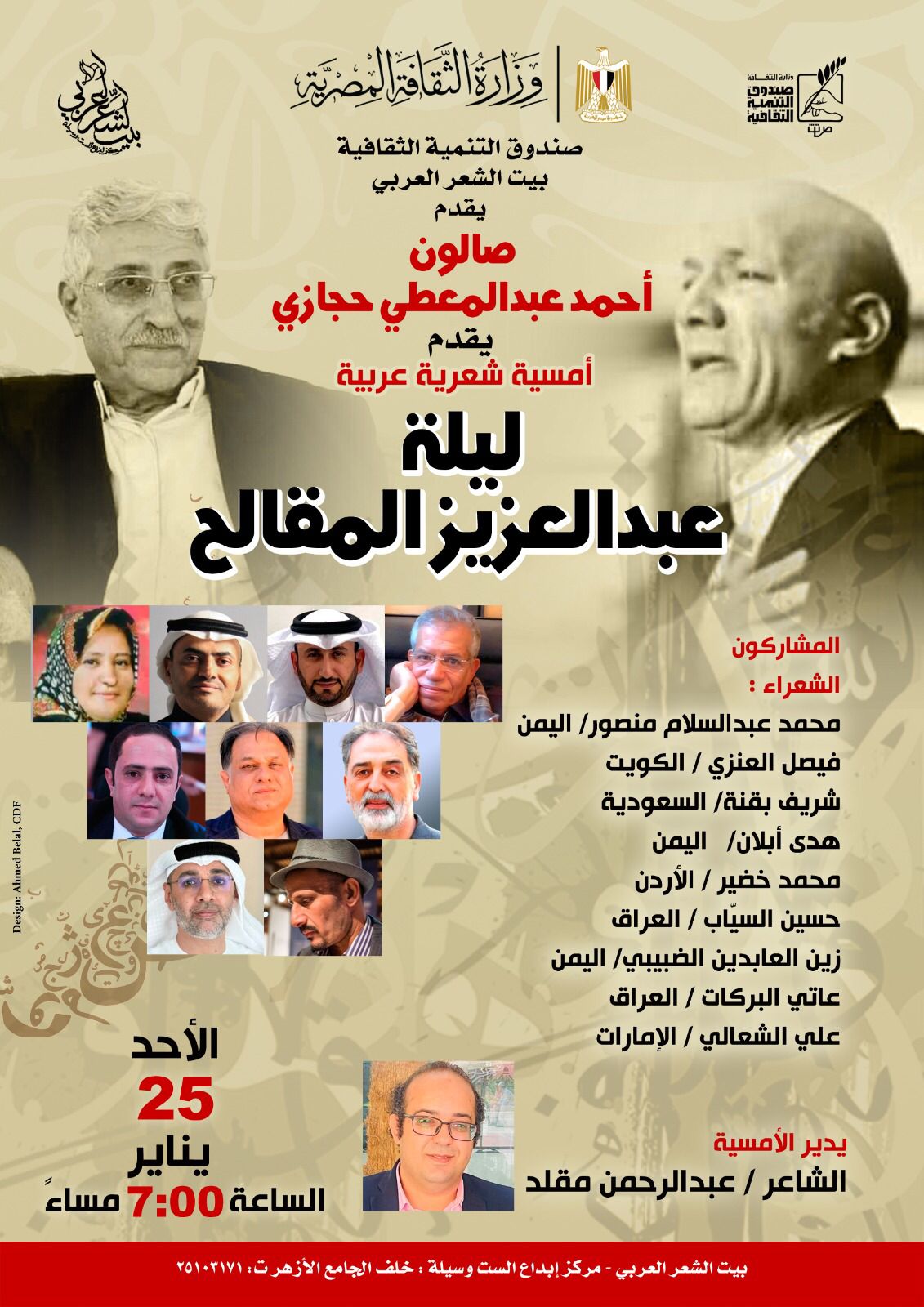 يستعد بيت الشعر العربي لاحتضان أمسية شعرية عربية استثنائية تحت عنوان «ليلة عبدالعزيز المقالح»، في حدث يجمع نخبة من أبرز الشعراء العرب، ليعكس المكان دوره الرائد كمنصة حيوية للتجارب الشعرية المعاصرة. وتأتي هذه الفعالية، المزمع إقامتها في السابعة مساء الأحد 25 يناير، ضمن سلسلة فعاليات صالون أحمد عبدالمعطي حجازي، الذي يعتبر من أبرز الفعاليات الشعرية الدورية في القاهرة، ويحرص على تكريم رموز الشعر العربي وإتاحة الفرصة للأصوات العربية المتنوعة للتفاعل والإبداع.