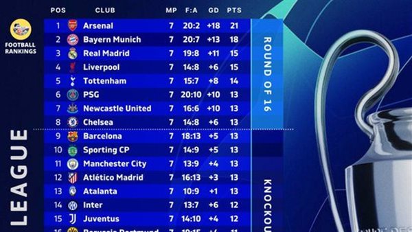 - جدول ترتيب دوري أبطال أوروبا 2025-2026 بعد نهاية الجولة السابعة