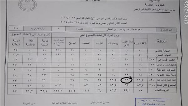 بدأ ظهور نتيجة الصف الثاني الثانوي للفصل الدراسي الأول 2025-2026 بشكل رسمي داخل عدد من المدارس، بينما لم يتم إعلان النتيجة في جميع المدارس حتى الآن، على أن يتم استكمال إعلانها تدريجيًا خلال الفترة المقبلة، فور الانتهاء من أعمال الرصد والمراجعة النهائية.