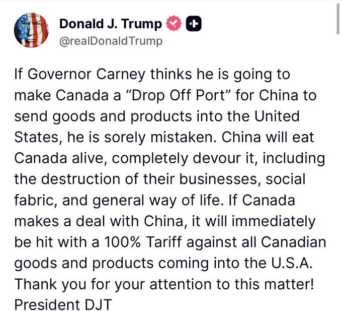 في منشوره يوم السبت، أشار ترامب إلى رئيس الوزراء باسم "الحاكم كارني" وكتب أنه إذا "كان يعتقد أنه سيجعل كندا "ميناءً للتسليم" للصين لإرسال البضائع والمنتجات إلى الولايات المتحدة، فهو مخطئ تماماً".