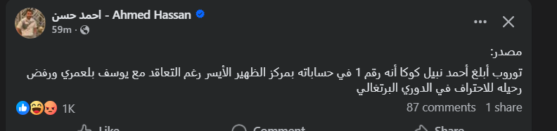 تحيا مصر، وكتب أحمد حسن عبر حسابه الرسمي"فيس بوك": توروب أبلغ أحمد نبيل كوكا أنه رقم 1 في حساباته بمركز الظهير الأيسر، رغم التعاقد مع يوسف بلعمري ورفض رحيله للاحتراف في الدوري البرتغالي.