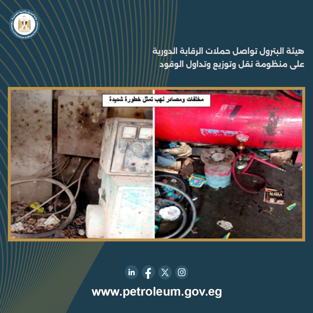 واصلت الهيئة المصرية العامة للبترول من خلال اللجنة المركزية للرقابة على تداول المنتجات البترولية ، تنفيذ حملات الرقابة الدورية خلال الأسبوع الثالث من يناير الجاري على مستودعات ومحطات وقود ومصانع ومخازن البوتاجاز بعدد من المحافظات .