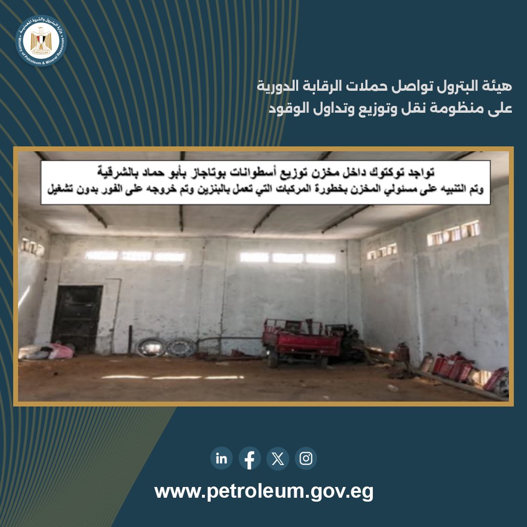 تم المرور على مخزن لتوزيع الأسطوانات بمركز أبو حماد بالشرقية، وتم رصد أخطاء تصميمية بمنظومة الإطفاء، والتنبيه بسرعة تعديلها، و التوعية بخطورة وجود مركبات تعمل بالبنزين داخل المخزن.